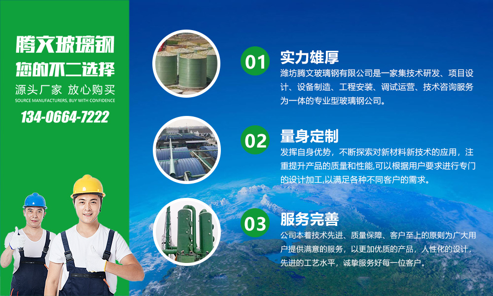 濰坊騰文玻璃鋼有限公司是一家集技術研發(fā)、項目設計、設備制造、工程安裝、調試運營、技術咨詢服務為一體的專業(yè)型玻璃鋼公司